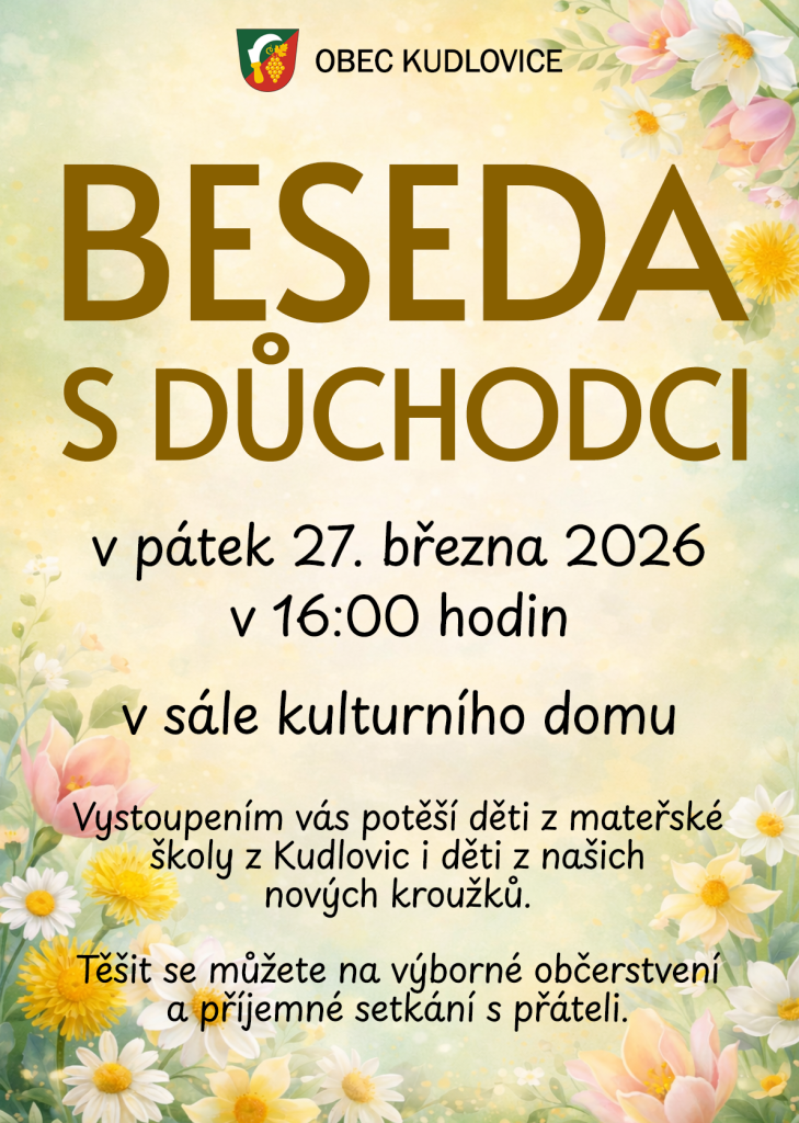 Beseda s důchodci se uskuteční v pátek 27. března 2026 od 16 hodin v sále kulturního domu. Těšit se můžete na vystoupení dětí z mateřské školy a také mladých lidí z nových kroužků. Akce nabídne také výborné občerstvení a příležitost k setkání s přáteli. Všichni jste srdečně zváni, přijďte si užít příjemné odpoledne.
